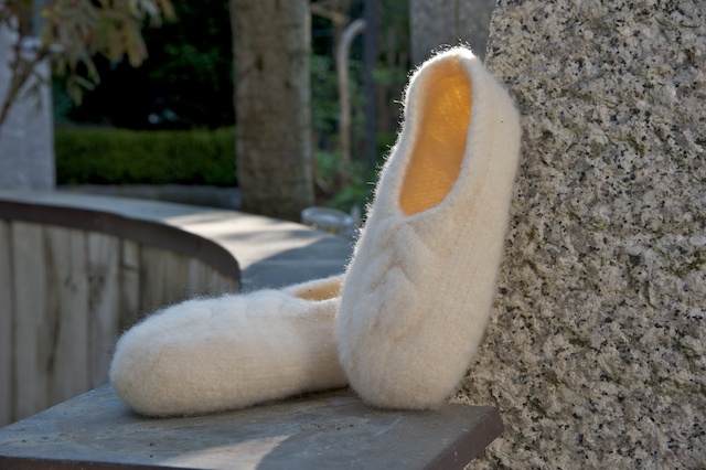 dann in der Waschmaschiene gefilzt, auf Schuhleisten gezogen, getrocknet und